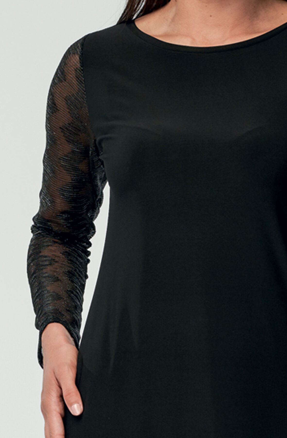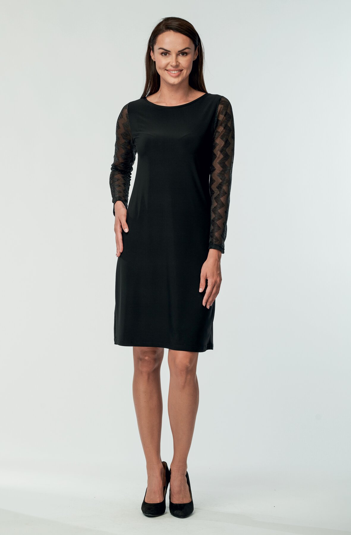 Přiléhavé dámské šaty s ozdobnými síťovanými dlouhými rukávy. Šaty jsou vhodné na různé společenské akce. Jsou vyrobené z lehkého a pružného polyesterového materiálu, který je splývavý a pohodlný.