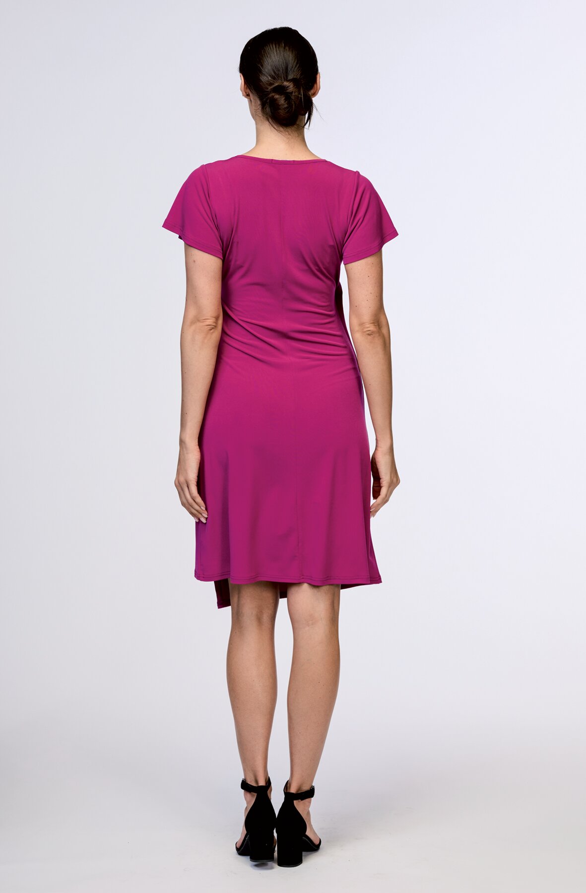 Dámské šaty s přeloženým předním dílem a řasením na boku. Šaty mají zvonový rukáv. Tvarovaná délka umocňuje zavinovací efekt. Šaty jsou vyrobené z lehkého a pružného polyesterového materiálu, který je splývavý a pohodlný.